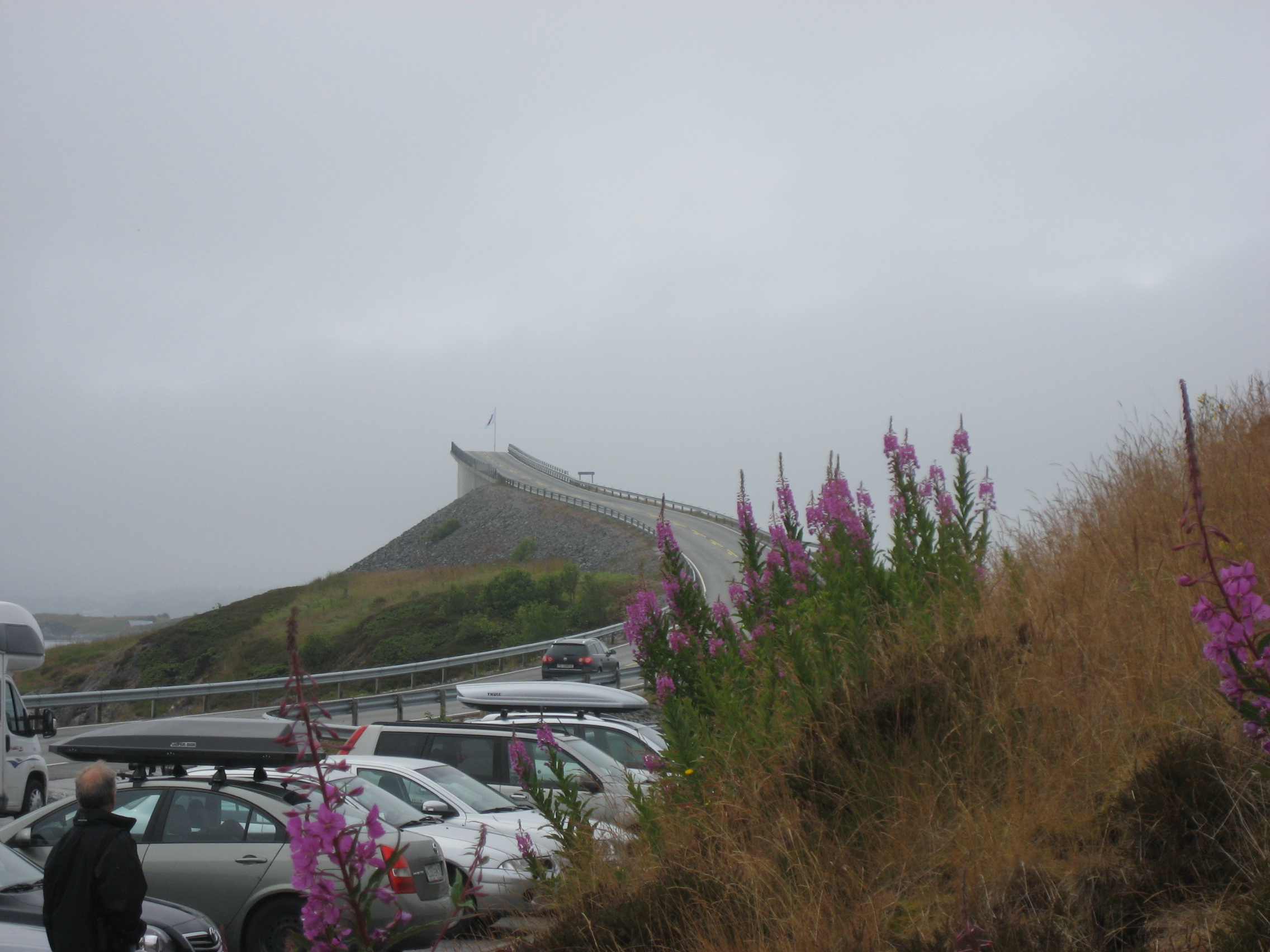 Vi tog to overnatninger i huset, for vi skulle jo køre på Atlanterhavsveien på vej til Kristiansund og så retur. Vejret var ikke helt med os, det var meget diset så billederne blev ikke så gode, men det var en flot vej. Broerne slynger sig flere steder opad samtidig med at de drejer. Meget specielt! Der var en del små parkeringspladser, hvor der holdt biler. Folk var ude at fiske! Som sagt måtte vi tage færgen fra Bremsnes til Kristiansund og retur, fordi Atlanterhavstunnelen ikke var helt færdig. Den blev først åbnet et halvt år senere.
