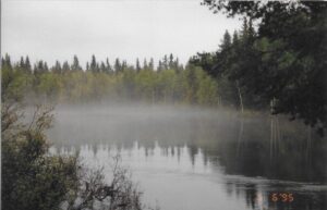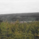 Foto til højre: Langs vejen er der kun skov, meget høje fyrretræer med birketræer som underskov. Birken betragtes som ukrudt, den kommer alle vegne. Når et areal af fyrretræer fældes, skal der plantes nye, men man lader enkelte træer stå og planter så ind imellem. Det gjorde man i hvert fald dengang!