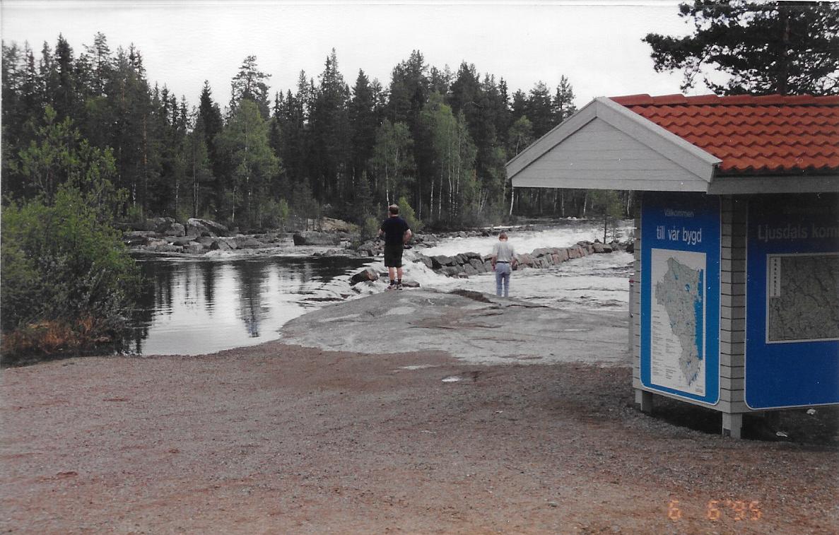 Her gør vi holdt ved elven Ljusnan ved byen Sveg. Også her er der MEGET vand. Der er en som vinker til os fra den anden side.
