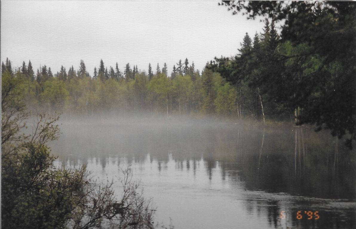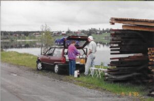 Billeder herover: Middagspause ved Fåker lidt syd for Östersund. Kørte til Dorotea, hvor vi fandt en hytte på Bjørnens Camping. Det var navnet på Campingpladsen dengang, den her måske skiftet navn? Der var ingen betjening men et tlf.nr. som vi ringede til og fik hytte 20, nøglen lå under måtten. Hytte med bad/toilet, køkken, 2 rum med 2 køjer i hver, TV med parabolprogrammer.
