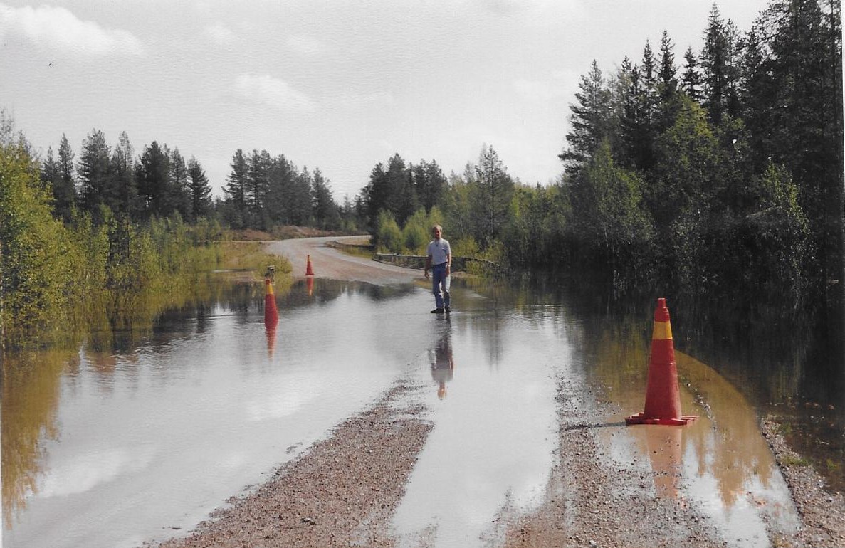Da vi nåede til Storuman var der vejspærring p.g.a. at broen ved Blattnicksele var under vand. Vi fik lov at passere, og skulle så køre til højre ad en grusvej ved Sandsele, mod sydøst, indtil vi nåede Vindelgransele. Her kunne vi komme over Vindelëlven og så fortsætte mod nord til Blattnicksele. En omvej på ca. 100 km på grusvej med højst 40/50 km i timen. 2 steder på den strækning måtte vi køre igennem en masse vand på vejen.