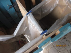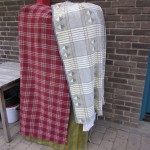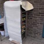 Hvis man er lidt fiks på fingrene, som min mand, og har en carport eller måske et andet udendørs sted som er overdækket, kan der for få midler laves en stor OVN med ribber. Prøv at få fat i nogle gamle ovnplader, som jeg har samlet, eller lav hylderne af træplader. Min model ser ud som på det første billede. Den ser lidt konisk ud, men det er den ikke. På det andet billede, har jeg lagt æblerne ind på hylderne. Jeg bruger et håndklæde under, men aviser kan også bruges. Jeg lægger dem med stilken opad, fordi jeg har set Bonderøven fra DRtv gøre det, men jeg ved ikke, om det er korrekt. Når æblerne er lagt ind, pakker jeg hele OVNEN ind i nogle (nye) tæpperester – billede 3 – og til sidst et par uldne tæpper yderst.