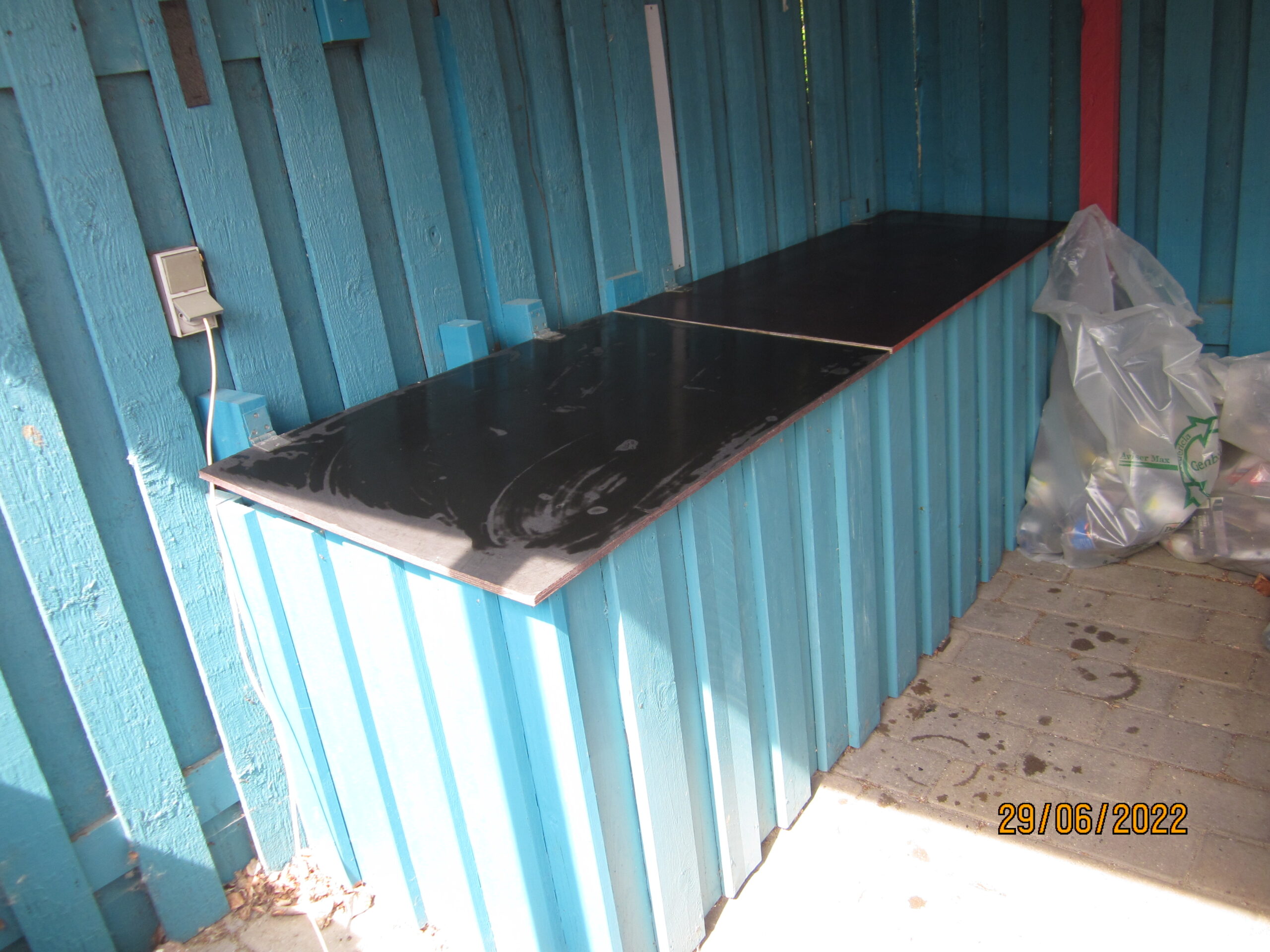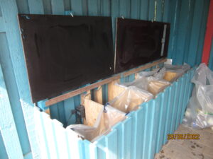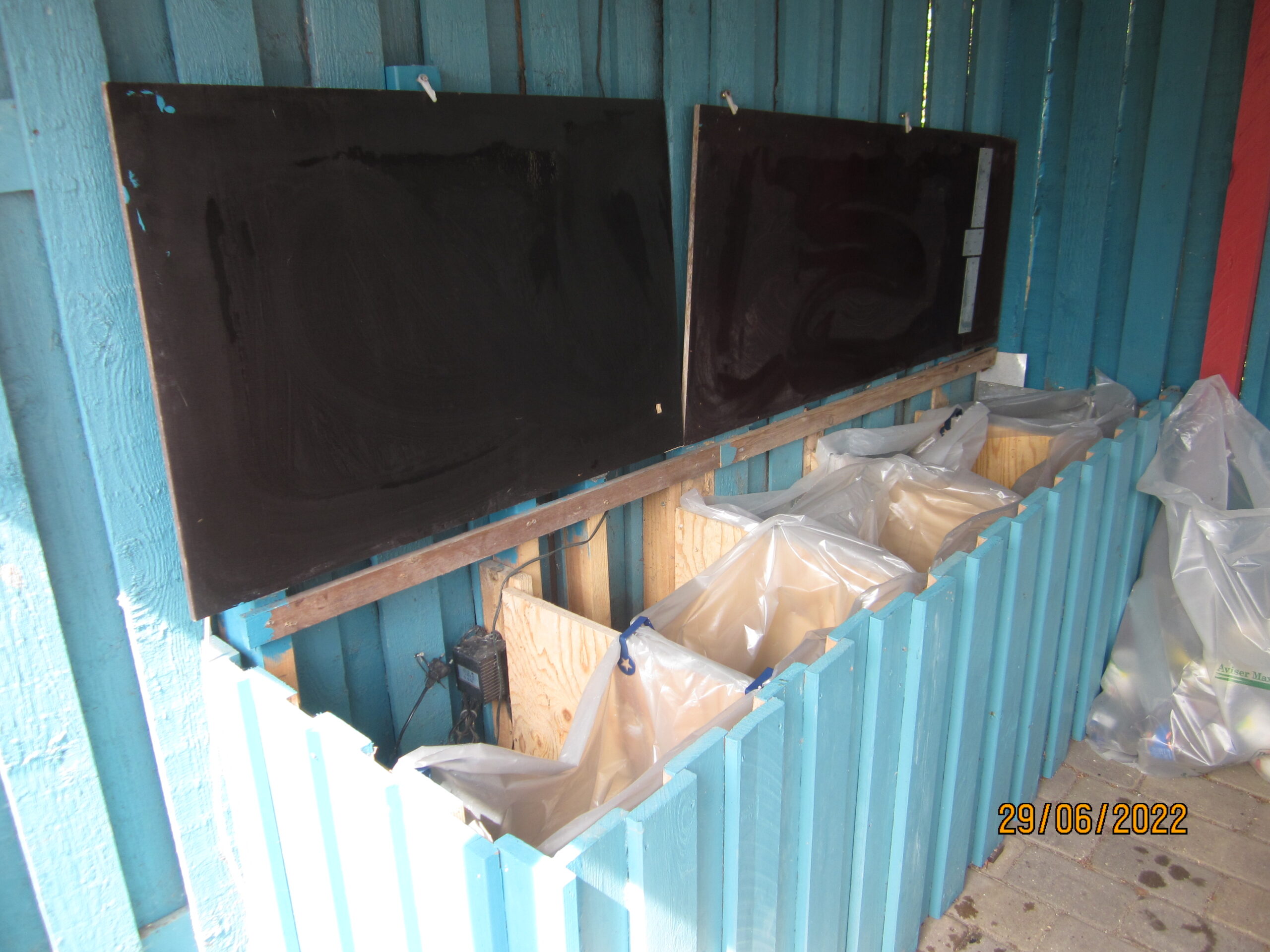 Papir, Pap, Glas, Plastic, Metal, Flamingo, Plastfolie, Mælkekartoner, Grøn affald og Rest affald. – Vi samler de forskellige ting – undtagen Grøn affald og Restaffald – i klare store plastposer, som vi får udleveret af Fredericia Kommune. Restaffald og grøn affald har vi en “skraldespand” med to rum til, der bliver tømt hver 14. dag. De andre poser stiller vi ud til vejen, når kommunen kommer og henter dem en gang om måneden. For enden af carporten har vi lavet vores egen “affaldssystem” sådan: – (billederne taler vist for sig selv)