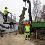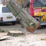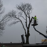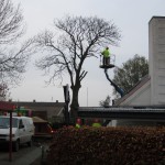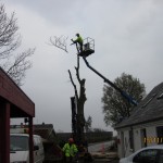 Den 15. november 2012. Kastanietræet var frostsprængt og der var nogle af de meget store grene i toppen, der var døde. Træet stod på kommunens grund, og det var derfor kommunens egne folk, som fjernede træet. Det tog ca. tre timer. Stubben mangler at blive fræset væk, så der kan blive lagt grus hen over. Billederne taler vist for sig selv. Klik her for at se kommunens flismaskine i arbejde.