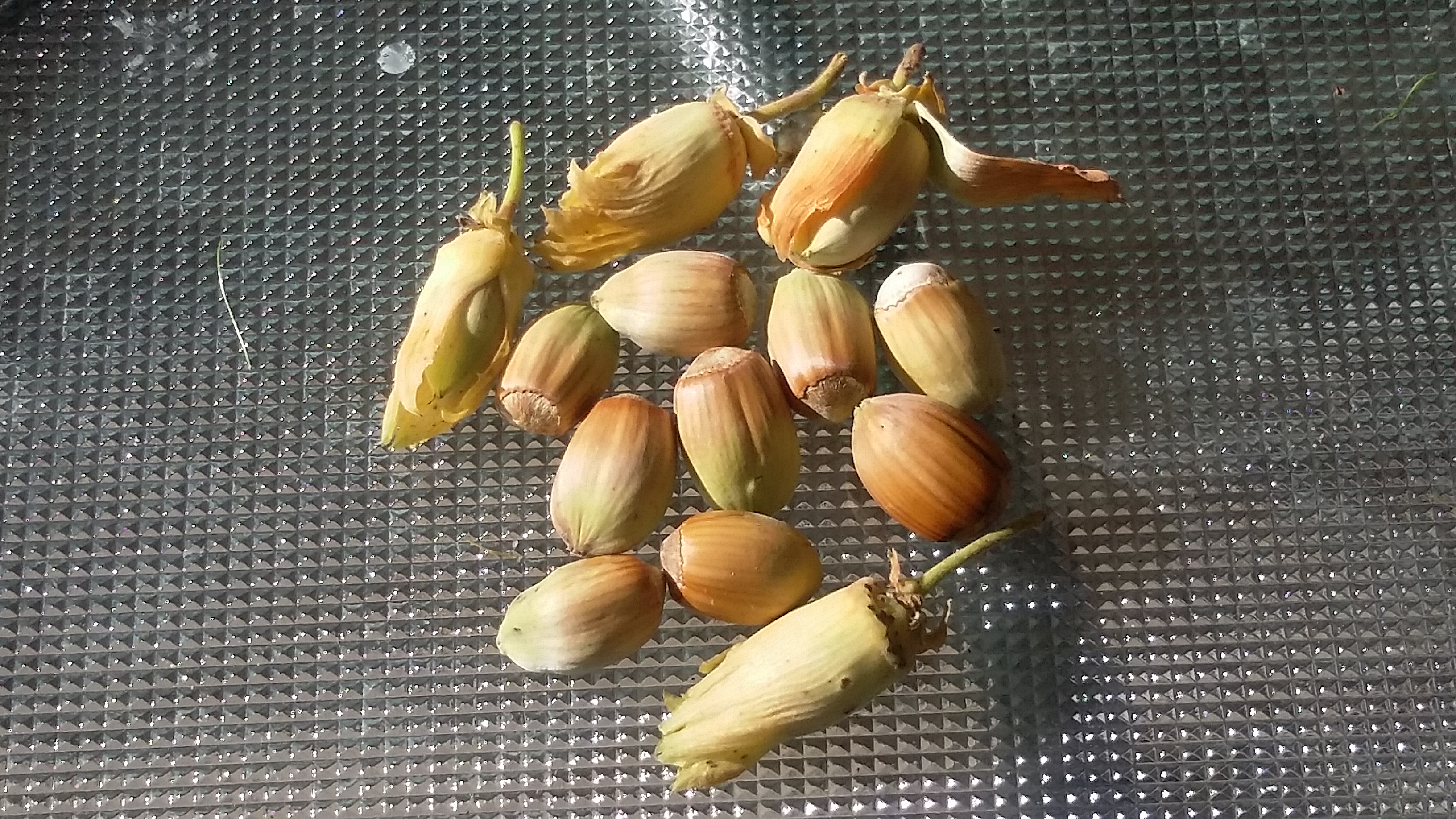 I år (2015) har vi haft rigtig mange hasselnødder. Vi har samlet nødder fra midt i september til omkring 1. november. Der er 6 store buske, og de har givet over 21 kg.